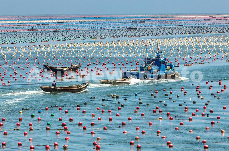 2023年8月15日,在山东省荣成市各大海洋牧场生态养殖区,渔民们驾驶渔船、舢板穿梭在彩色生态养殖浮漂间,进行渔业养殖管护、贝类播种等海上作业。