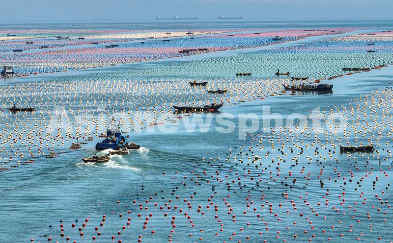 2023年8月15日,在山东省荣成市各大海洋牧场生态养殖区,渔民们驾驶渔船、舢板穿梭在彩色生态养殖浮漂间,进行渔业养殖管护、贝类播种等海上作业。