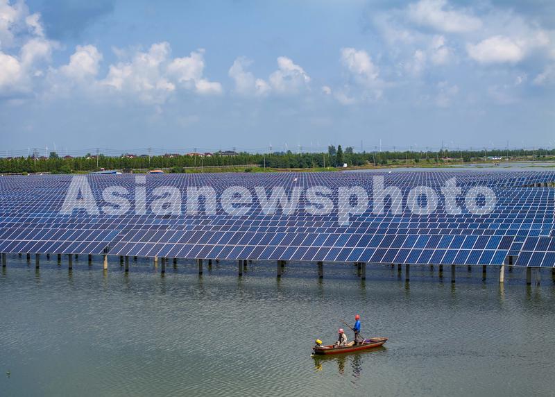 图片说明:2023年8月15日,渔民在江苏泰州兴化市千垛镇“渔光互补”光伏发电项目基地对鱼塘围网进行补桩扶桩(无人机照片)。
