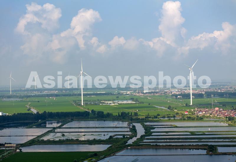 图片说明:2023年8月15日,在江苏泰州兴化市经济开发区拍摄的风电与田野、蓝天白云相映成趣(无人机照片)。