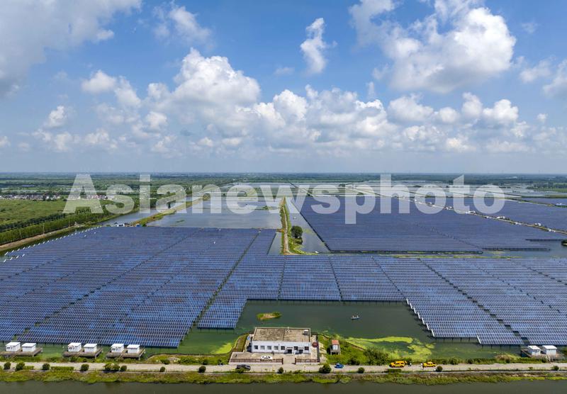 图片说明:2023年8月15日,电力志愿者在江苏泰州兴化市千垛镇“渔光互补”光伏发电项目基地巡检(无人机照片)。