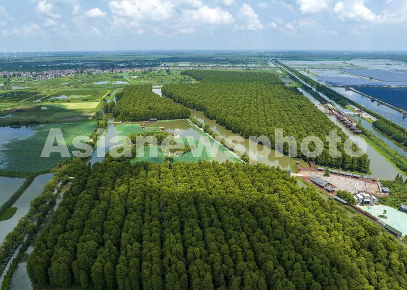 图片说明:2023年8月15日,拍摄的江苏泰州兴化市里下河国家湿地公园生态美景(无人机照片)。