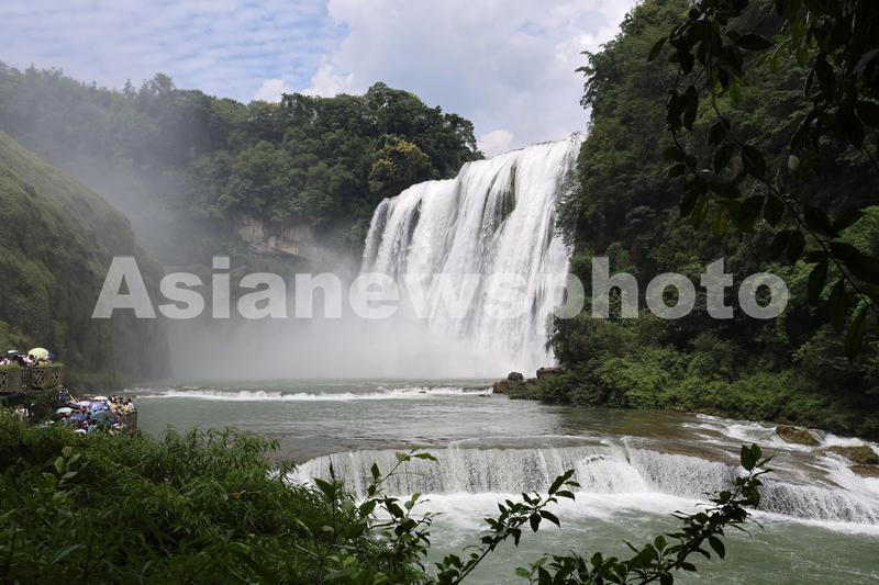 图片说明:2023年8月13日,贵州省安顺市,正值丰水期的黄果树大瀑布宏伟壮观,气势磅礴,吸引游客前来观赏。