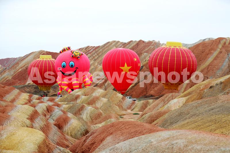 8月16日,热气球即将飞越甘肃张掖七彩丹霞景区。