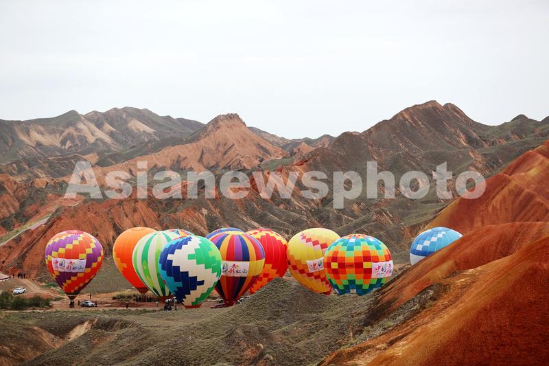 8月16日,热气球即将飞越甘肃张掖七彩丹霞景区。