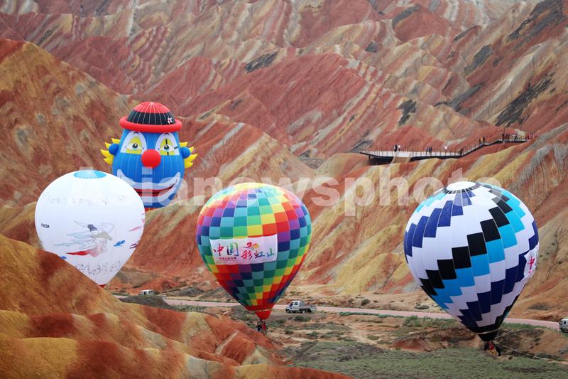 8月16日,热气球即将飞越甘肃张掖七彩丹霞景区。