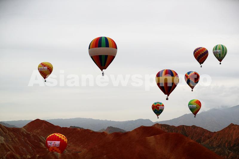 8月16日,热气球飞越甘肃张掖七彩丹霞景区。