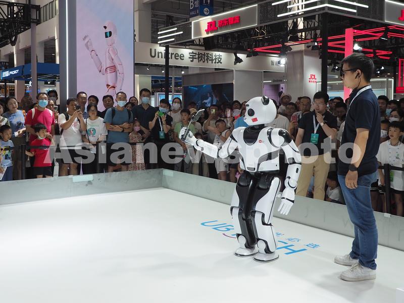 2023年8月19日,北京亦创会展中心2023世界机器人大会上,熊猫机器人手持自拍杆与观众合影。