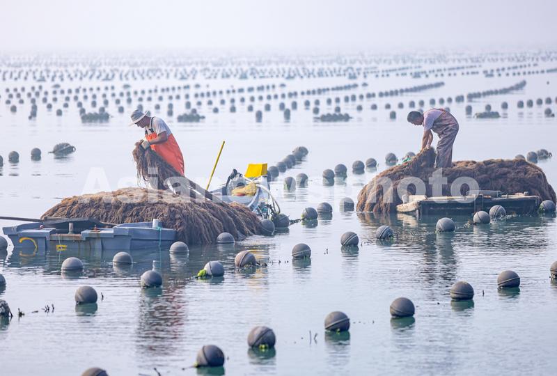 2023年8月18日,在山东省荣成市俚岛镇俚岛湾海洋牧场生态养殖区,养殖工人在收获龙须菜,海上生产一派繁忙景象。龙须菜又称江蓠,不仅是生产制作琼脂的原料,更是养殖鲍鱼的优质饲料。养殖户们利用海上作物的生长规律巧打“时间差”,实行龙须菜多茬化养殖,在收获完海带的养殖架上继续养殖龙须菜,避免了养殖水域的闲置,提高海上养殖的产出效益,促进当地养殖户的增收,是名副其实的“致富菜”。据悉,2023年荣成市的龙须菜预计年产量约为15万吨。