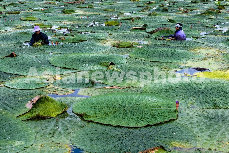 图片说明:2023年8月21日,江苏省泰州市姜堰区顾高镇申俞村农民在采收芡实(无人机照片)。