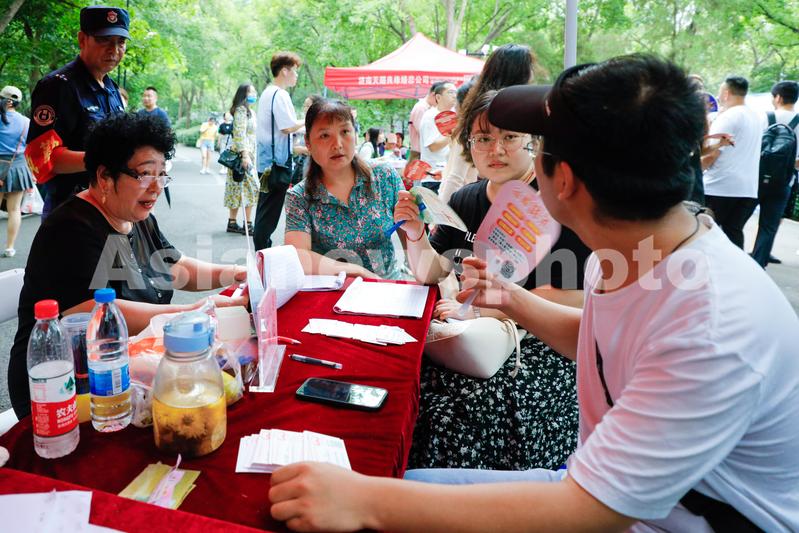 2023年8月20日,市民在山东济南第17届七夕千佛山相亲大会上咨询相亲信息。