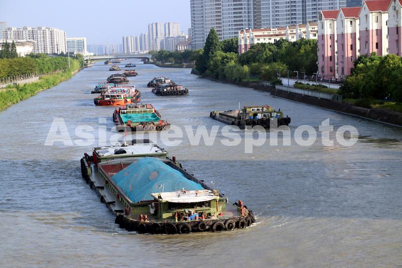 图片说明:2023年8月21日,货物运输船只行驶在京杭大运河江苏苏州段。