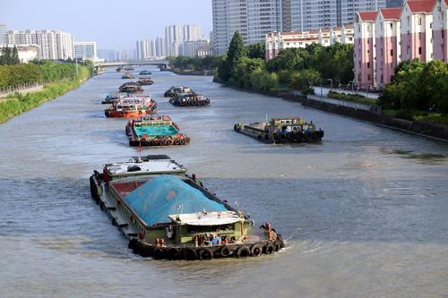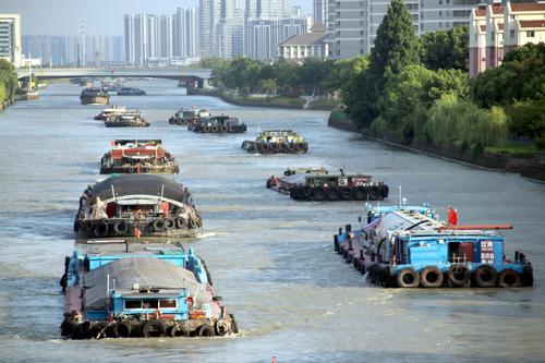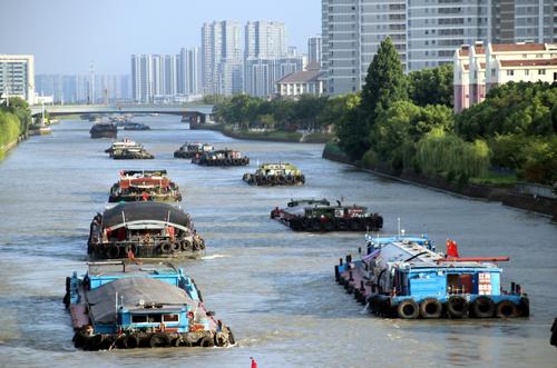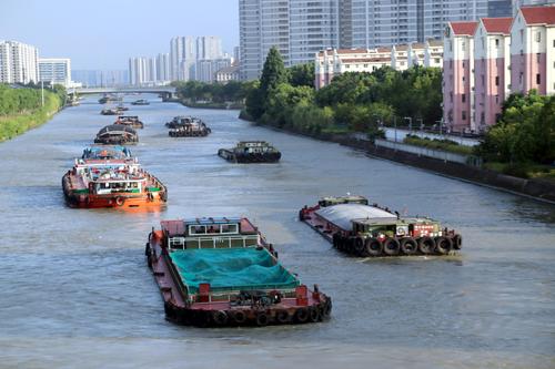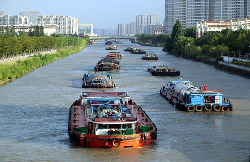 图片说明:2023年8月21日,货物运输船只行驶在京杭大运河江苏苏州段。