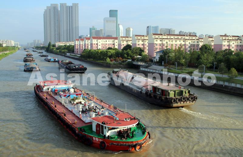图片说明:2023年8月21日,货物运输船只行驶在京杭大运河江苏苏州段。