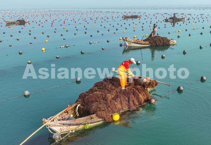 2023年8月18日,在山东省荣成市俚岛镇俚岛湾海洋牧场生态养殖区,养殖工人在收获龙须菜,海上生产一派繁忙景象。龙须菜又称江蓠,不仅是生产制作琼脂的原料,更是养殖鲍鱼的优质饲料。养殖户们利用海上作物的生长规律巧打“时间差”,实行龙须菜多茬化养殖,在收获完海带的养殖架上继续养殖龙须菜,避免了养殖水域的闲置,提高海上养殖的产出效益,促进当地养殖户的增收,是名副其实的“致富菜”。据悉,2023年荣成市的龙须菜预计年产量约为15万吨。