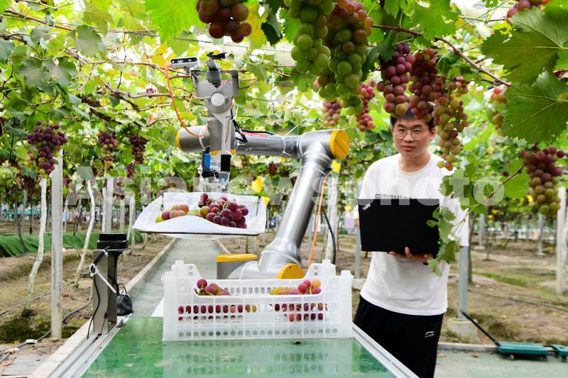 2023年8月18日,在浙江省金华市浦江县靓松家庭农场葡萄园里,杭州自动化技术研究院软件工程师正在调试、操作智慧葡萄采摘机器人,机械臂将精准定位到的一串串成熟葡萄进行采摘作业,为现代农业提供科技支持。