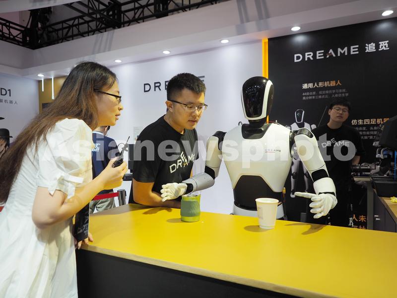 2023年8月19日,北京亦创会展中心2023世界机器人大会上,观众在参观“咖啡机器人”。