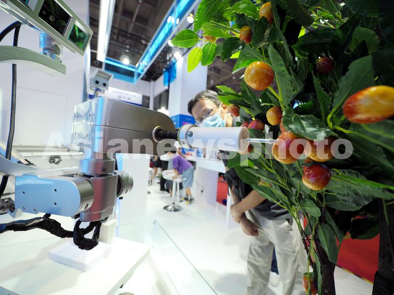 2023年8月19日,北京亦创会展中心2023世界机器人大会上,观众在参观“采摘机器人”。