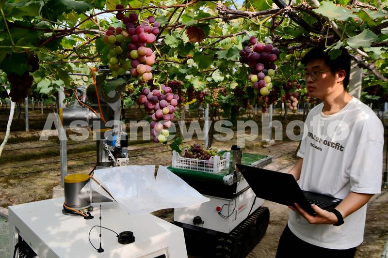 2023年8月18日,在江省金华市浦江县靓松家庭农场葡萄园里,杭州自动化技术研究院软件工程师正调试操作智慧葡萄采摘机器人在采摘作业,为现代农业提供科技支持。