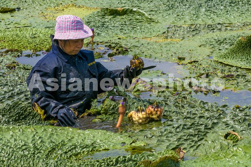 图片说明:2023年8月21日,江苏省泰州市姜堰区顾高镇申俞村农民在采收芡实(无人机照片)。