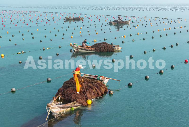2023年8月18日,在山东省荣成市俚岛镇俚岛湾海洋牧场生态养殖区,养殖工人在收获龙须菜,海上生产一派繁忙景象。龙须菜又称江蓠,不仅是生产制作琼脂的原料,更是养殖鲍鱼的优质饲料。养殖户们利用海上作物的生长规律巧打“时间差”,实行龙须菜多茬化养殖,在收获完海带的养殖架上继续养殖龙须菜,避免了养殖水域的闲置,提高海上养殖的产出效益,促进当地养殖户的增收,是名副其实的“致富菜”。据悉,2023年荣成市的龙须菜预计年产量约为15万吨。
