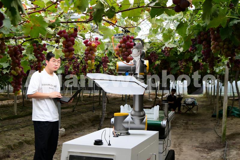 2023年8月18日,在江省金华市浦江县靓松家庭农场葡萄园里,杭州自动化技术研究院软件工程师正调试操作智慧葡萄采摘机器人在采摘作业,为现代农业提供科技支持。
