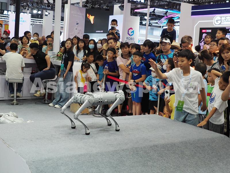 2023年8月19日,北京亦创会展中心2023世界机器人大会上,观众在参观机器狗的表演。