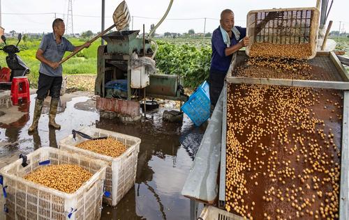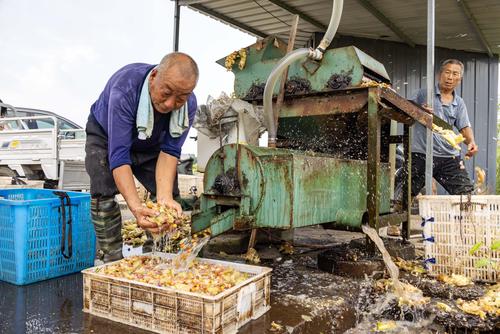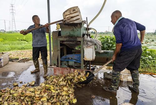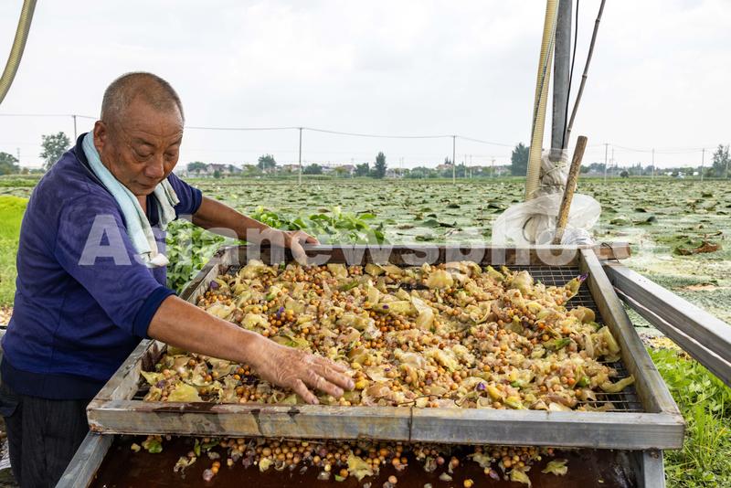 图片说明:2023年8月21日,江苏省泰州市姜堰区顾高镇申俞村的农民将芡实种仁进行清洗。