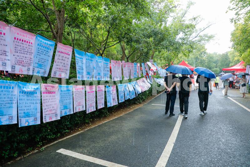 2023年8月20日,市民在山东济南第17届七夕千佛山相亲大会上观看相亲信息。