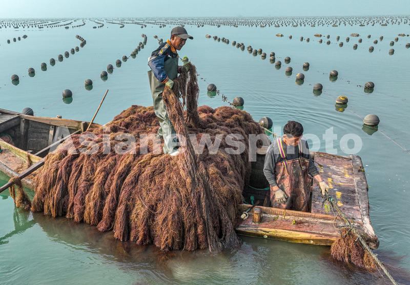 2023年8月18日,在山东省荣成市俚岛镇俚岛湾海洋牧场生态养殖区,养殖工人在收获龙须菜,海上生产一派繁忙景象。龙须菜又称江蓠,不仅是生产制作琼脂的原料,更是养殖鲍鱼的优质饲料。养殖户们利用海上作物的生长规律巧打“时间差”,实行龙须菜多茬化养殖,在收获完海带的养殖架上继续养殖龙须菜,避免了养殖水域的闲置,提高海上养殖的产出效益,促进当地养殖户的增收,是名副其实的“致富菜”。据悉,2023年荣成市的龙须菜预计年产量约为15万吨。