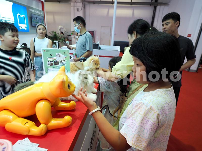 2023年8月19日,北京亦创会展中心2023世界机器人大会上,小朋友与机器猫互动。