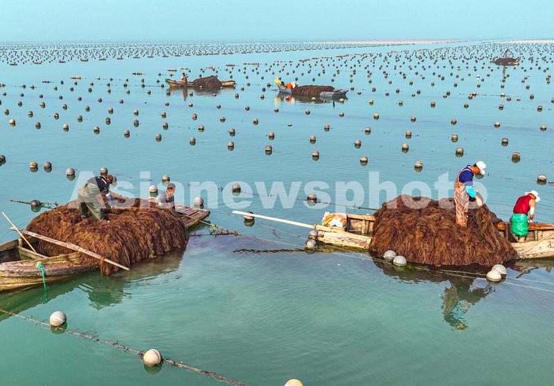 2023年8月18日,在山东省荣成市俚岛镇俚岛湾海洋牧场生态养殖区,养殖工人在收获龙须菜。
