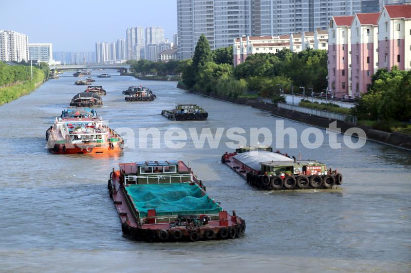 图片说明:2023年8月21日,货物运输船只行驶在京杭大运河江苏苏州段。