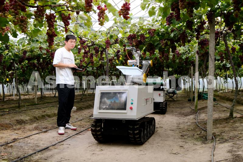 2023年8月18日,在江省金华市浦江县靓松家庭农场葡萄园里,杭州自动化技术研究院软件工程师正调试操作智慧葡萄采摘机器人在采摘作业,为现代农业提供科技支持。