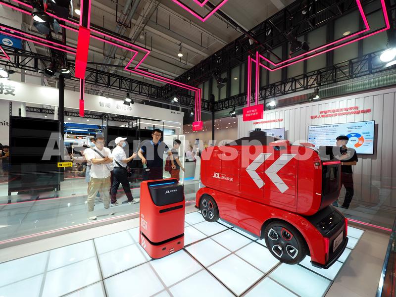 2023年8月19日,北京亦创会展中心2023世界机器人大会上,观众在参观“京东物流智能快递车”。