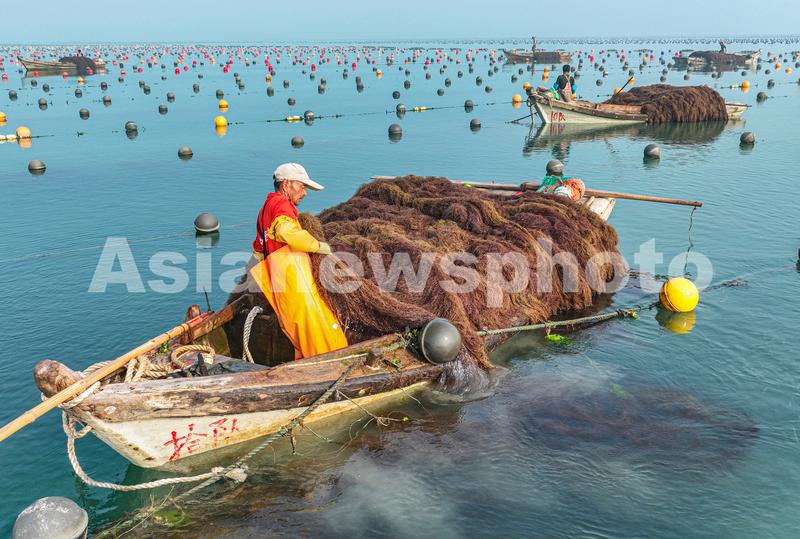 2023年8月18日,在山东省荣成市俚岛镇俚岛湾海洋牧场生态养殖区,养殖工人在收获龙须菜。