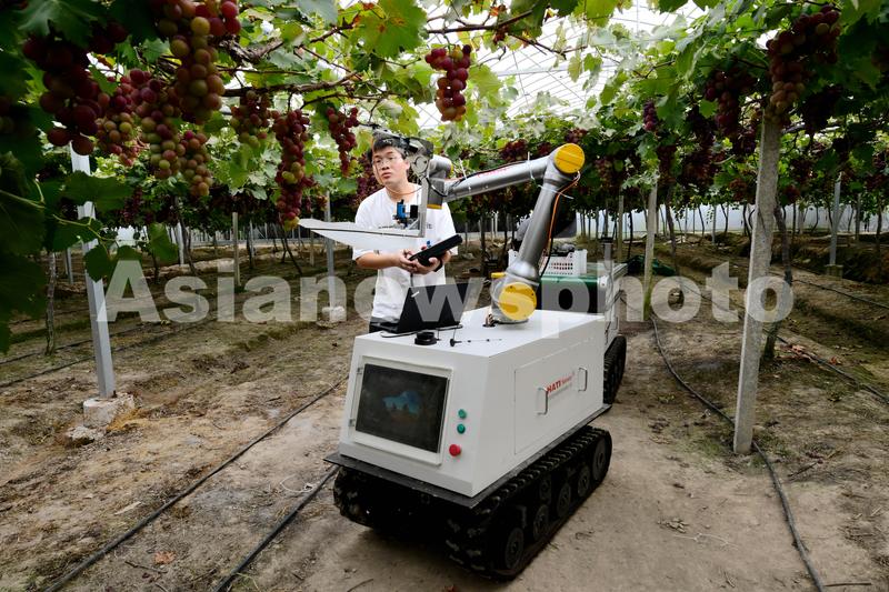 2023年8月18日,在江省金华市浦江县靓松家庭农场葡萄园里,杭州自动化技术研究院软件工程师正调试操作智慧葡萄采摘机器人在采摘作业,为现代农业提供科技支持。