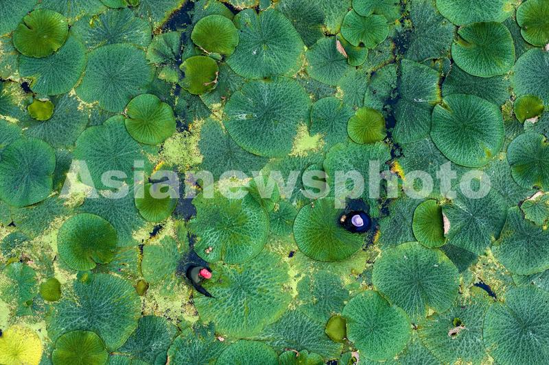 图片说明:2023年8月21日,江苏省泰州市姜堰区顾高镇申俞村农民在采收芡实(无人机照片)。