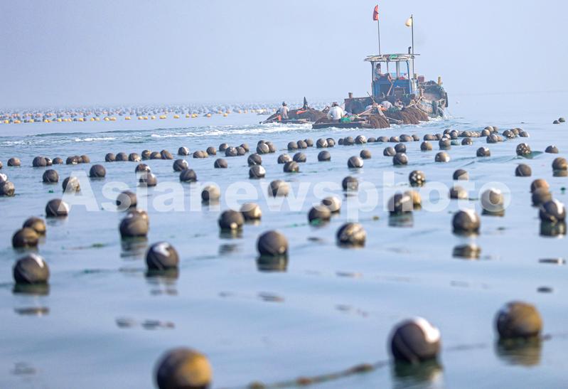2023年8月18日,在山东省荣成市俚岛镇俚岛湾海洋牧场生态养殖区,养殖工人在收获龙须菜,海上生产一派繁忙景象。龙须菜又称江蓠,不仅是生产制作琼脂的原料,更是养殖鲍鱼的优质饲料。养殖户们利用海上作物的生长规律巧打“时间差”,实行龙须菜多茬化养殖,在收获完海带的养殖架上继续养殖龙须菜,避免了养殖水域的闲置,提高海上养殖的产出效益,促进当地养殖户的增收,是名副其实的“致富菜”。据悉,2023年荣成市的龙须菜预计年产量约为15万吨。