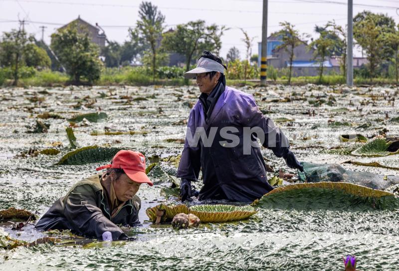 图片说明:2023年8月21日,江苏省泰州市姜堰区顾高镇申俞村农民在采收芡实。
