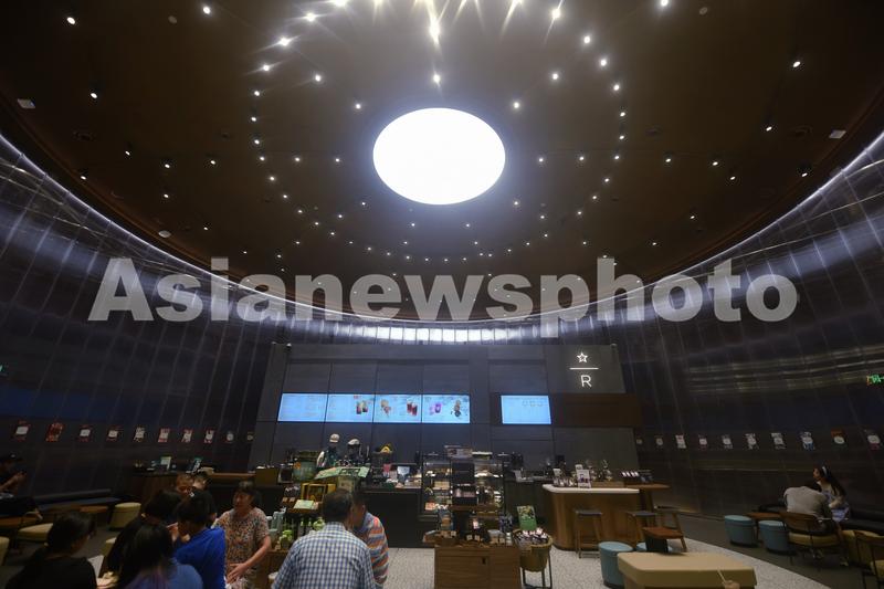 2023年8月20日,杭州市民在大型油罐改建而来的星巴克门店里品尝咖啡。