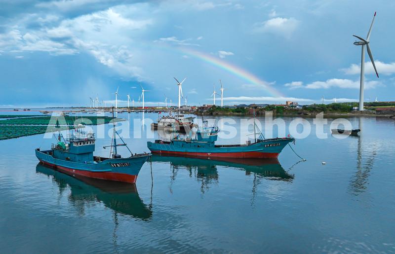 图片说明:2023年8月21日,山东省荣成市石岛管理区桑沟湾海洋牧场,一场暴雨过后,天空出现彩虹景观。