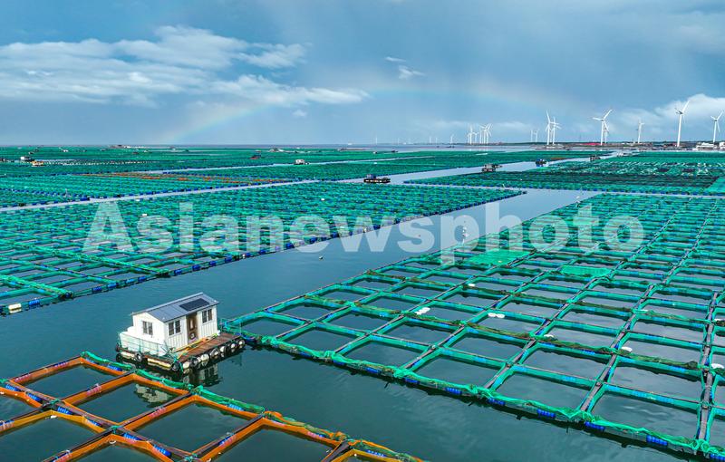 图片说明:2023年8月21日,山东省荣成市石岛管理区桑沟湾海洋牧场,一场暴雨过后,天空出现彩虹景观。