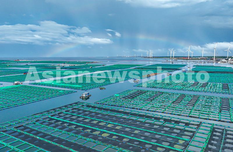 图片说明:2023年8月21日,山东省荣成市石岛管理区桑沟湾海洋牧场,一场暴雨过后,天空出现彩虹景观。