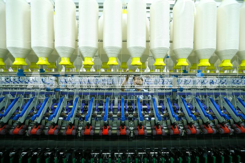图片说明:2023年8月22日,在位于山东省青岛市即墨区即发龙山工业园的青岛即发盛宝纺织有限公司,工人在数字化纺纱智能生产线上生产高端纤维。