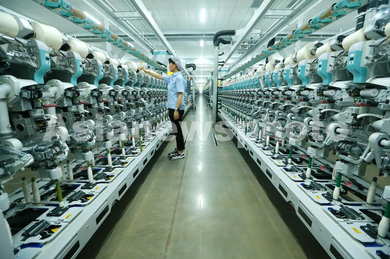 图片说明:2023年8月22日,在位于山东省青岛市即墨区即发龙山工业园的青岛即发盛宝纺织有限公司,工人在数字化纺纱智能生产线上生产高端纤维。