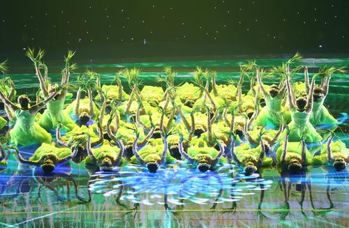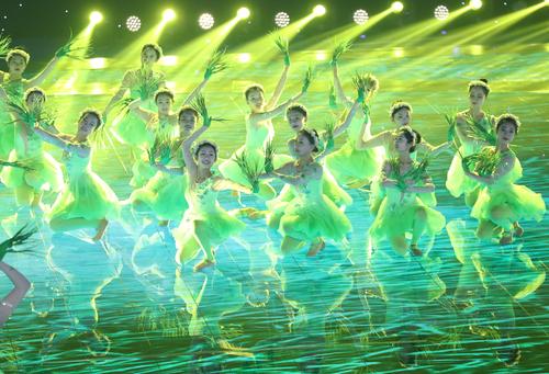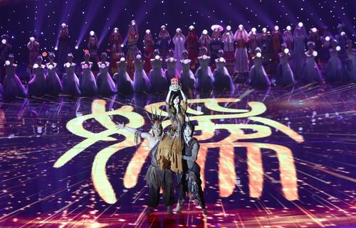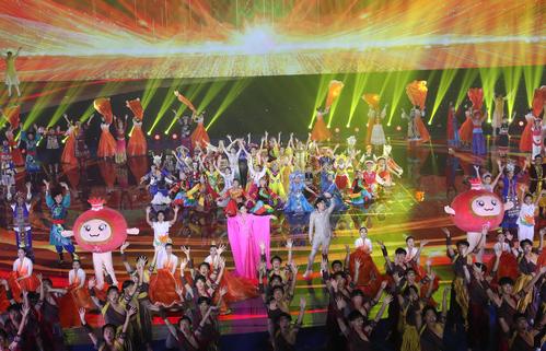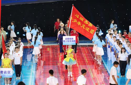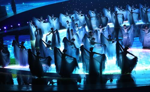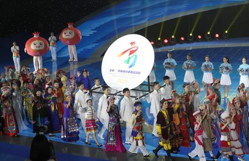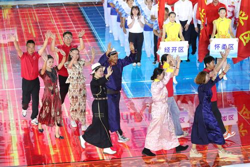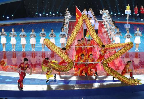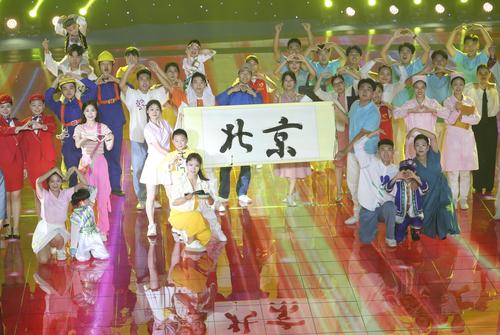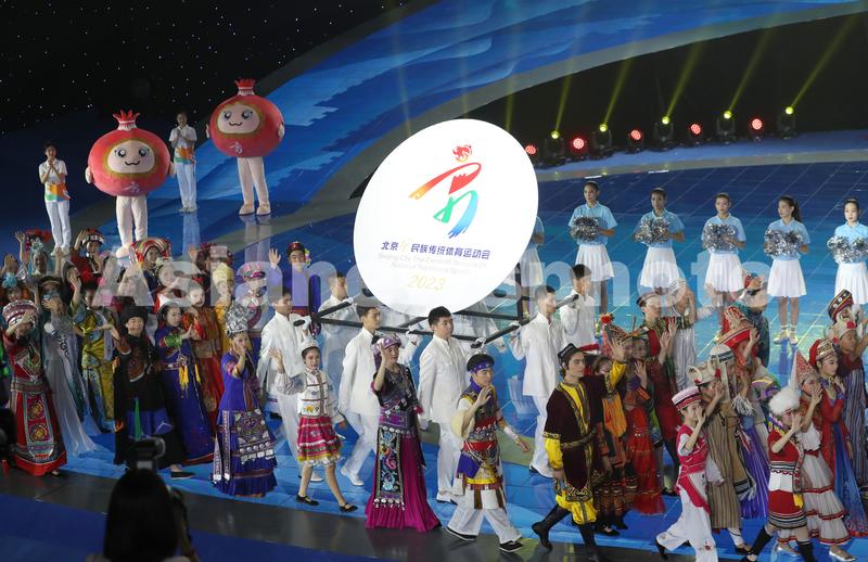 图片说明:北京市第十一届民族传统体育运动会会徽在开幕式上入场。
