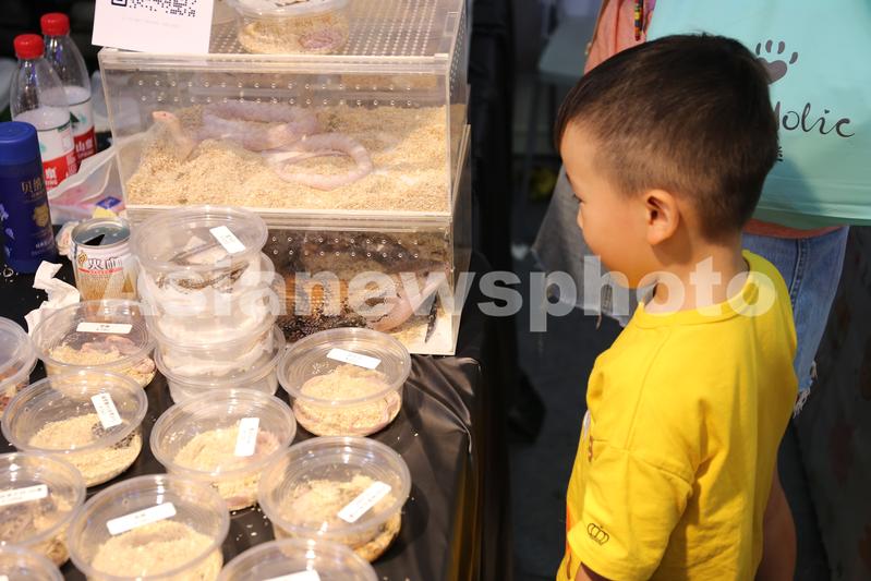 2023年8月18日,上海,亚洲宠物展览会特设异宠馆展示常见家宠之外的“另类宠物”,小朋友被蜥蜴和玉米蛇等冷血爬行动物吸引。