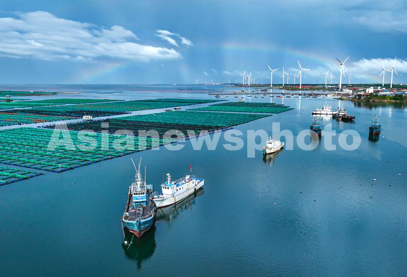 图片说明:2023年8月21日,山东省荣成市石岛管理区桑沟湾海洋牧场,一场暴雨过后,天空出现彩虹景观。