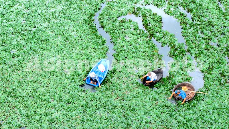 2023年8月22日,浙江省湖州市长兴县和平镇横山村,村民划着菱桶采摘菱角。